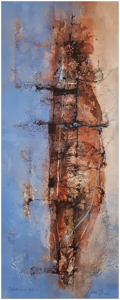 Terug in het blauw boven de allesomringende klei €1750,- Formaat: 125 bij 65 cm